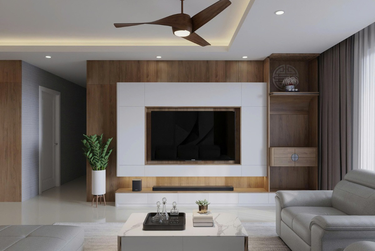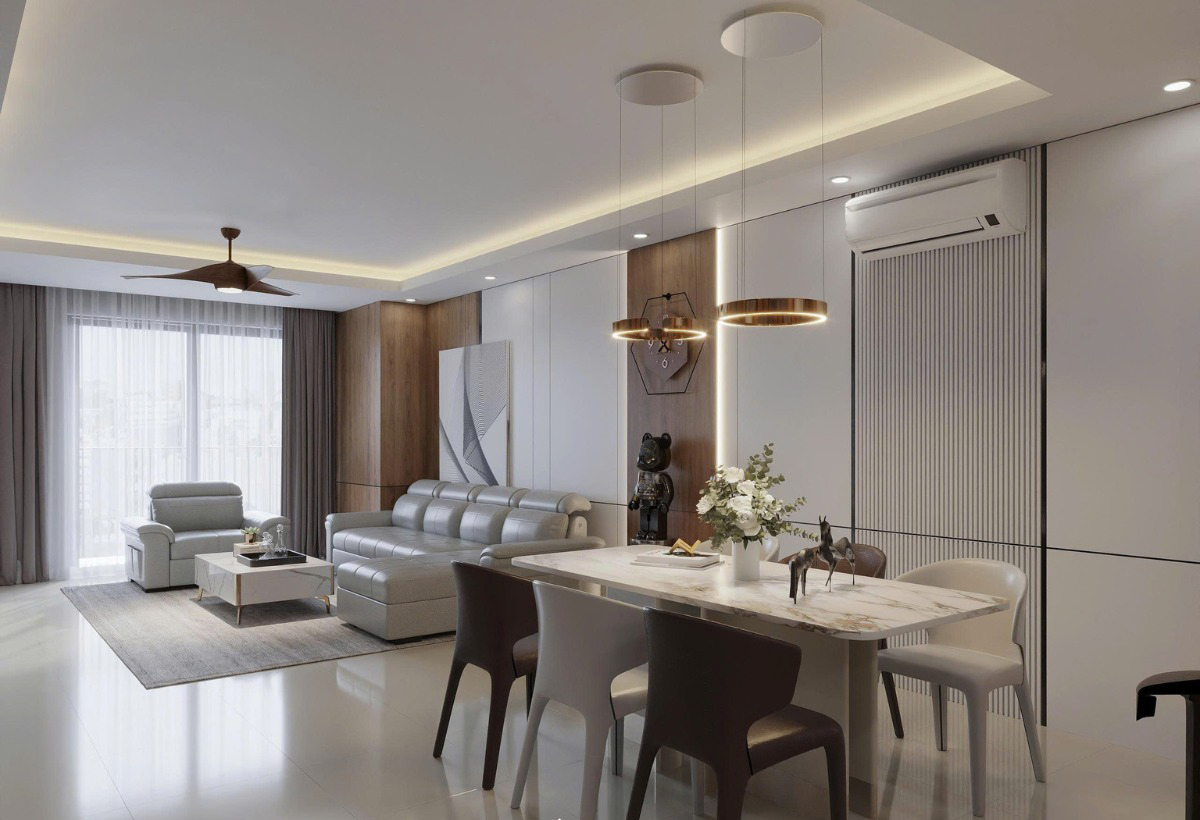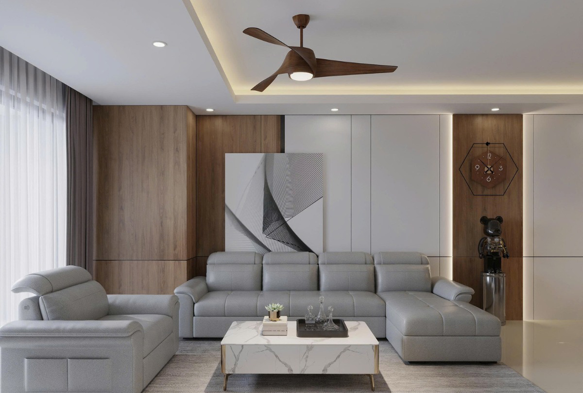 Tổng thể phòng khách được thiết kế hiện đại mang lại cảm giác gọn gàng, sang trọng nhưng vẫn rất gần gũi trong sinh hoạt gia đình. Các chi tiết nội thất được tiết chế hợp lý, tập trung vào công năng và sự thoải mái, giúp không gian luôn thông thoáng và dễ sử dụng. Hệ đèn hắt trần kết hợp cùng quạt trần không chỉ tăng tính thẩm mỹ mà còn tạo nên bầu không khí dễ chịu, giúp phòng khách luôn sáng thoáng và thư giãn.